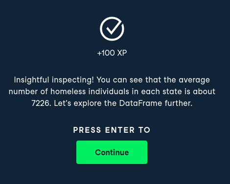 homelessnessis a DataFrame containing estimates of homelessness in each U.S. state in 2018. Theindividualcolumn is the number of homeless individuals not part of a family with children. Thefamily_memberscolumn is the number of homeless individuals part of a family with children. Thestate_popcolumn is the state's total population.